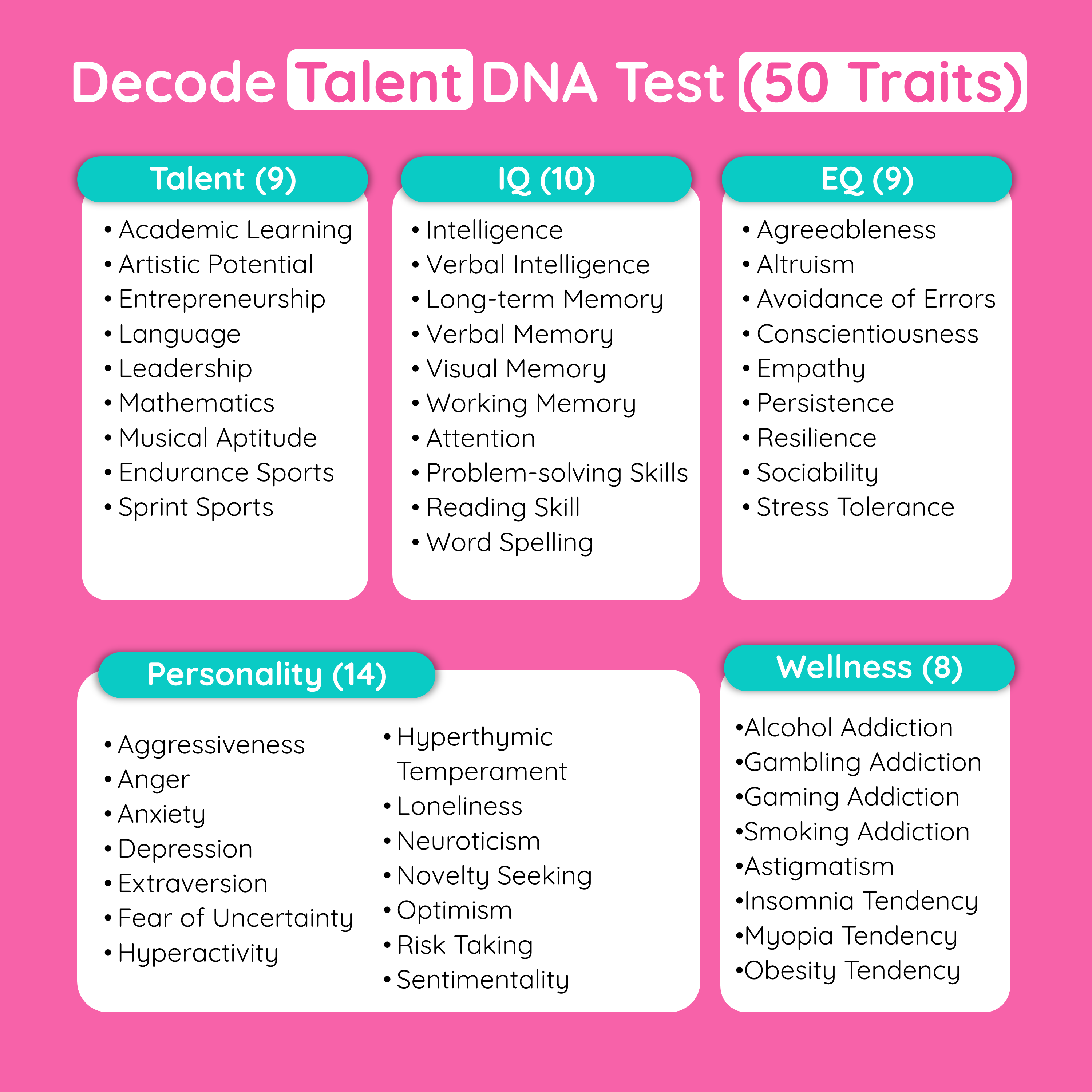 With a DNA report covering 50 personal traits, including talents, IQ, EQ, personality, and overall wellness, you’ll be empowered to practice confident, personalized parenting.
